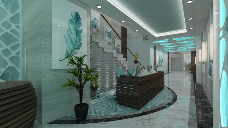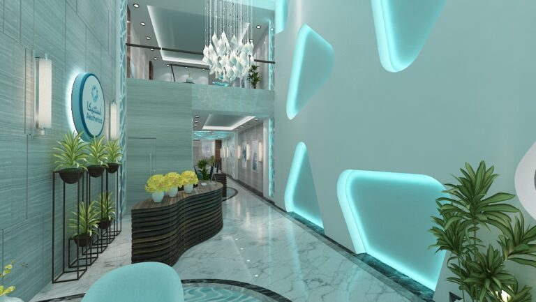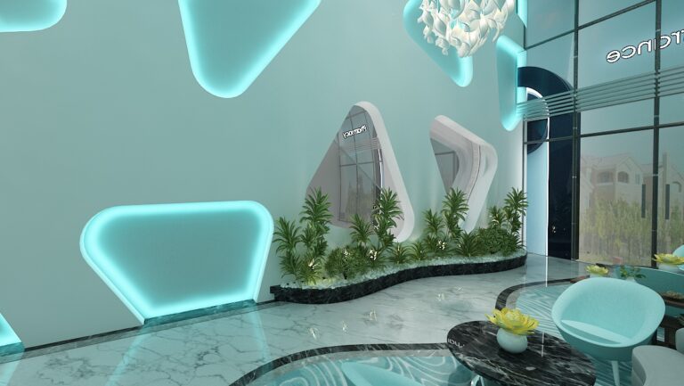 تميزت شركة تصميم داخلي الرياض “Vera Interior” في هذا المشروع باستخدام خطوط منحنية ناعمة وجدران مضيئة بطريقة ثلاثية الأبعاد، ما يمنح المكان لمسة مستقبلية ومريحة في آن واحد. منطقة الاستقبال صُممت بأسلوب احترافي يُبرز هوية العلامة التجارية للعيادة، ويمنح الزائر انطباعًا أوليًا قويًا عن جودة الخدمة. كما تم استخدام النباتات الطبيعية والتفاصيل الجمالية كعنصر توازن بصري وروحي داخل المساحة.