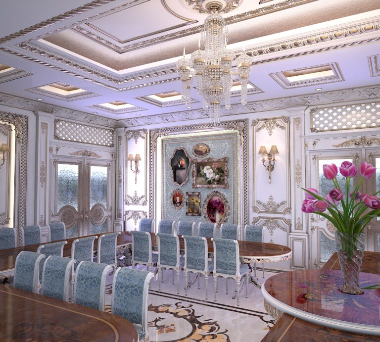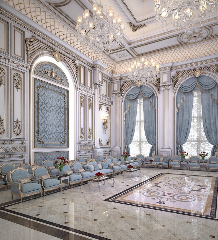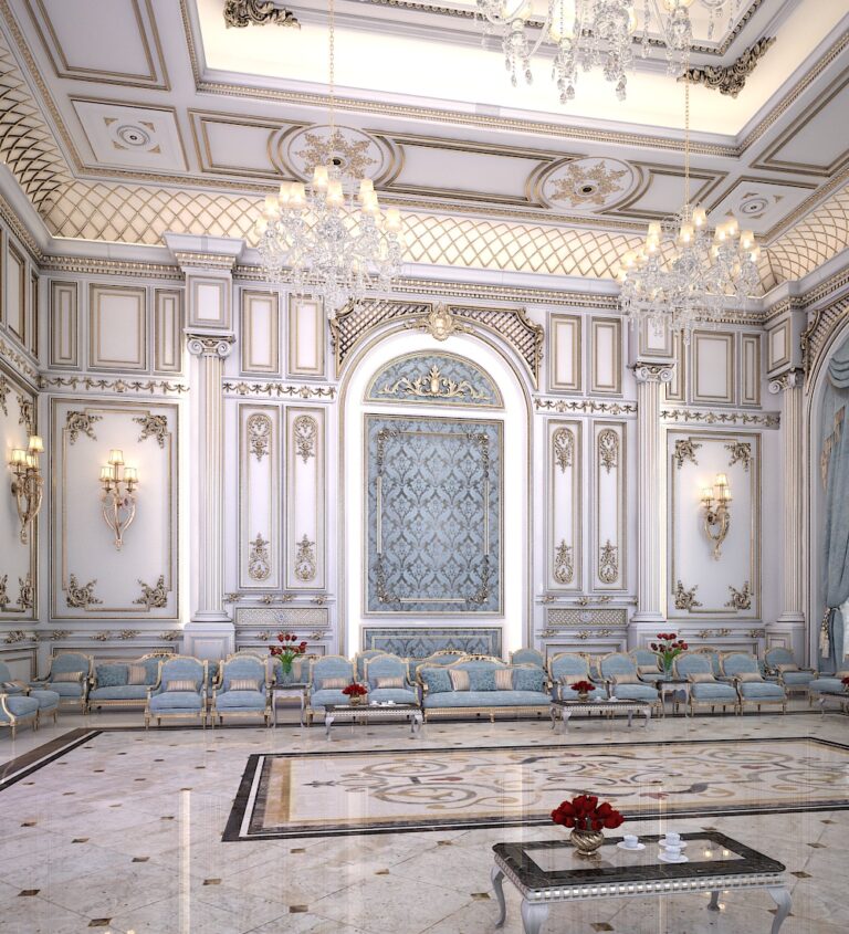 تم تنفيذ المشروع بعناية فائقة في كل تفصيلة، بداية من استخدام الزخارف الذهبية المنحوتة على الجدران والأعمدة، مرورًا بالستائر المخملية المزينة بشرائط ذهبية، وانتهاءً بالثريات الكريستالية البراقة التي تنسدل من الأسقف المزخرفة. كما يعكس الأثاث الفاخر بتنجيده الأزرق السماوي أناقة لا مثيل لها، ويعزز الإحساس بالبذخ والترف في كل ركن.