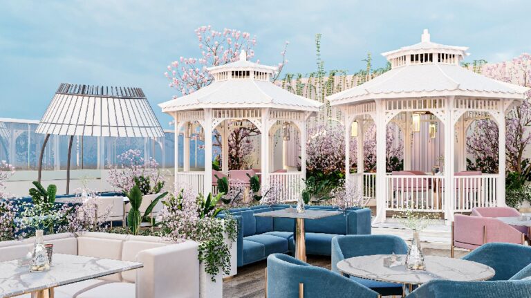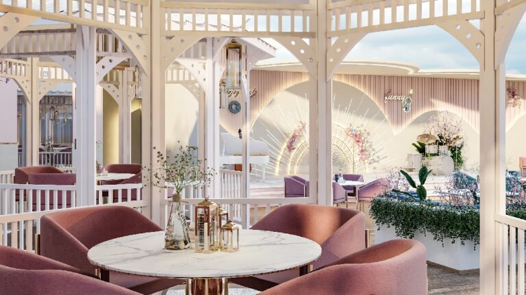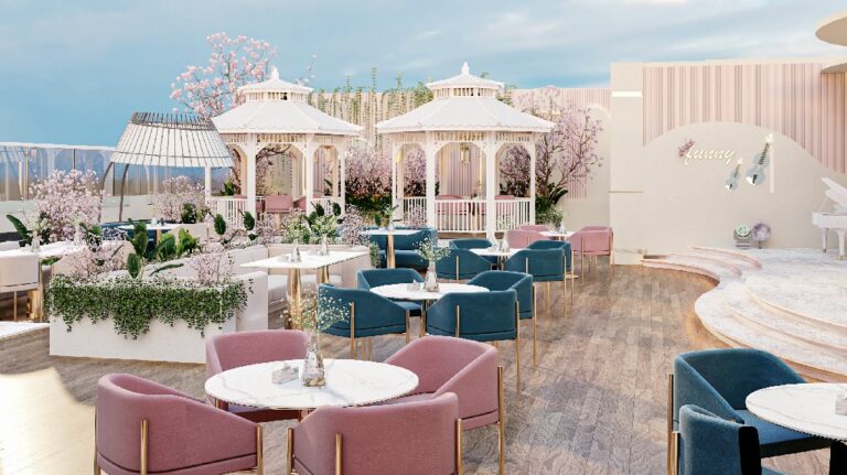 الواجهة الخارجية للكافيه تنقل الزائر إلى عالم من الجمال مع استخدام العرائش الخشبية البيضاء المُزيّنة بالأزهار، والتي تعزز من الإحساس بالاسترخاء والتميز. أما المنصة الموسيقية في الداخل فتُعبر عن لمسة فنية متقنة، ما يجعل من المكان وجهة مثالية لعشاق الأجواء الراقية.