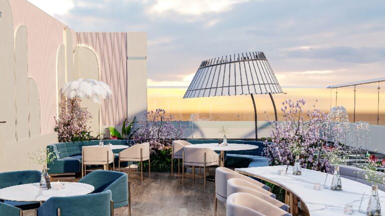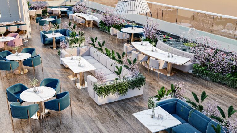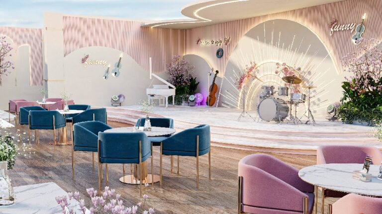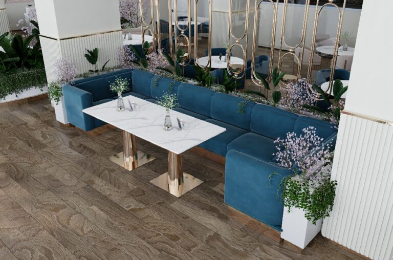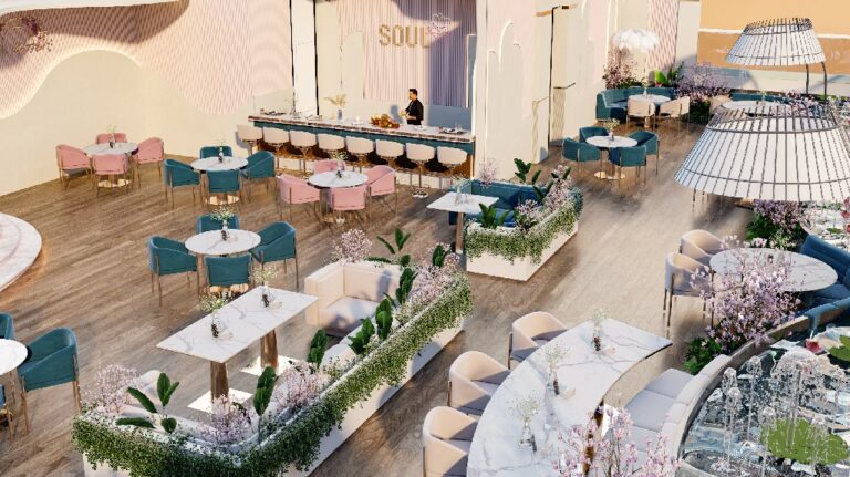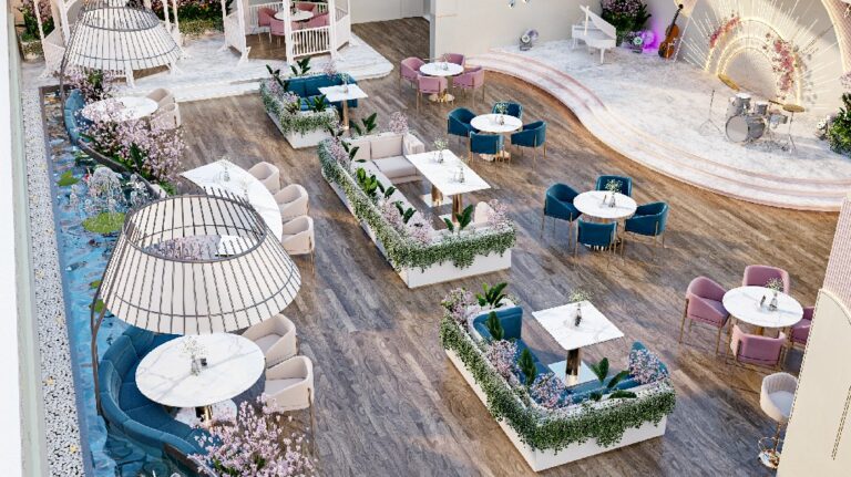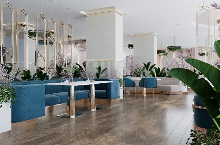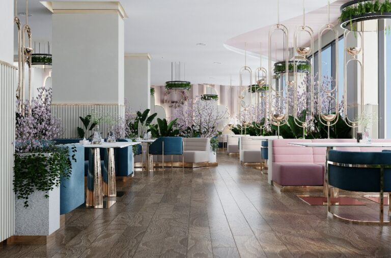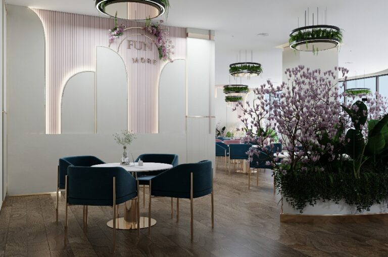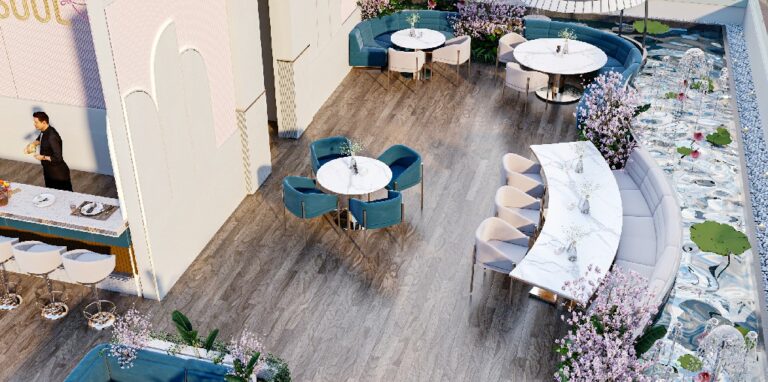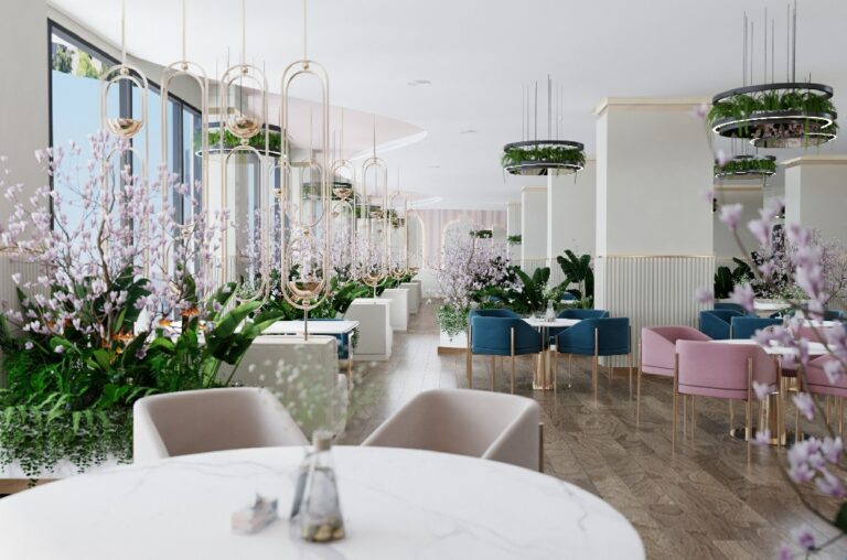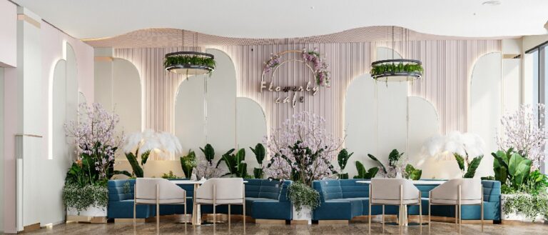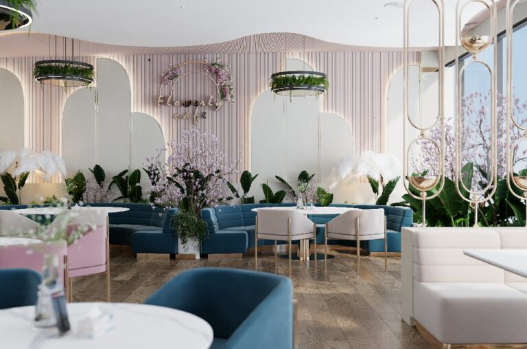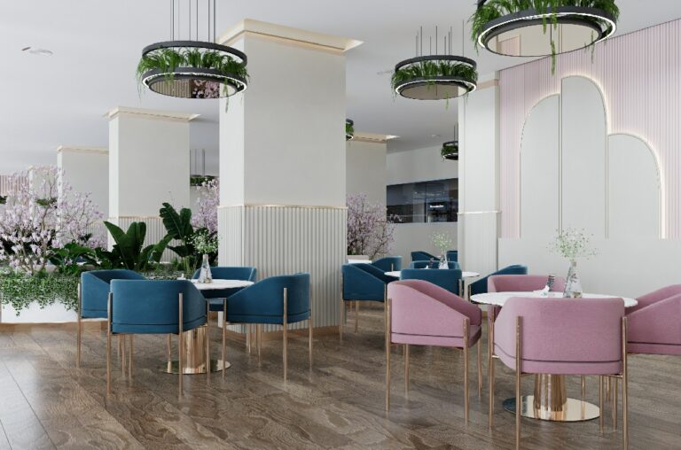 يمتاز المشروع باستخدام ألوان ناعمة كدرجات الوردي والأزرق الملكي، إلى جانب الذهب اللامع، مما يضفي فخامة دافئة على المكان. تظهر وحدات الجلوس بتنوعها ما بين الأرائك الدائرية والكراسي المنفردة لتوفر راحة وأناقة في آنٍ واحد. كما أن النباتات الطبيعية المعلقة والمتدلية من وحدات الإضاءة المبتكرة تمنح المكان حياةً ولمسة طبيعية.