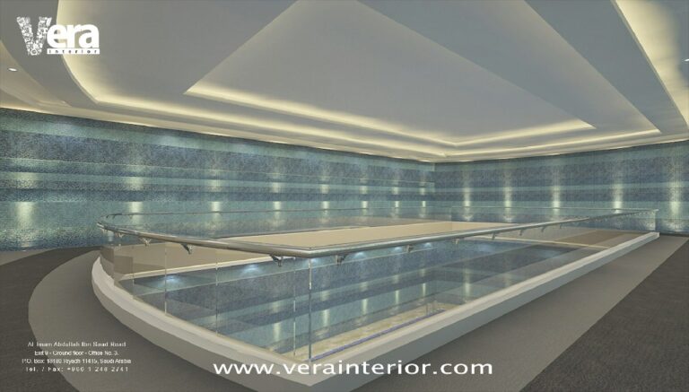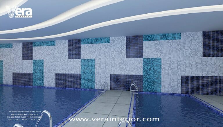 ويبرز في التصميم أيضًا منطقة المسبح التي تعكس الحداثة من خلال الجدران المكسوة بألوان متناسقة وأنماط هندسية فريدة، إلى جانب الأسقف المنحنية بتصميم عصري يضيف روح الابتكار للمكان.
