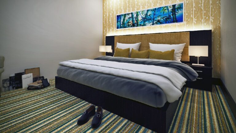 أما الغرف الفندقية فتم اعتماد أسلوب عصري مريح، بألوان دافئة ونقوش جدارية حديثة تخلق جوًا من الراحة والهدوء. الأرضيات المزخرفة والسجاد الملوّن يضيفان لمسة حيوية للمساحات الخاصة بالنزلاء.