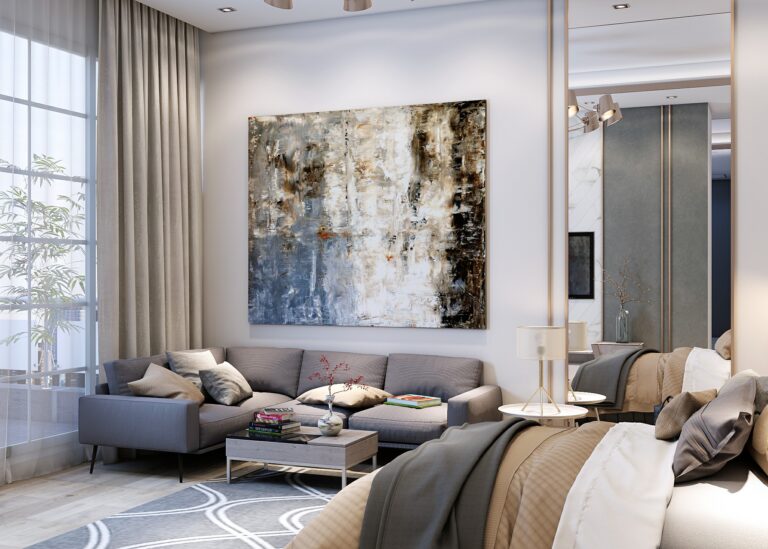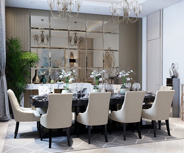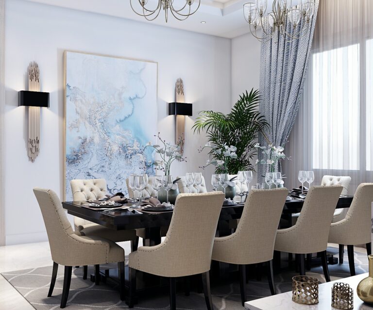 أما غرف الطعام، فتجمع بين الرقي والعملية، حيث صممت الطاولات والكراسي بتفاصيل أنيقة تلائم المناسبات الخاصة والاجتماعات العائلية. بينما جاءت غرف النوم بلمسات ناعمة وألوان مريحة لخلق بيئة مثالية للاسترخاء، مع دمج عناصر فنية عصرية على الجدران.
