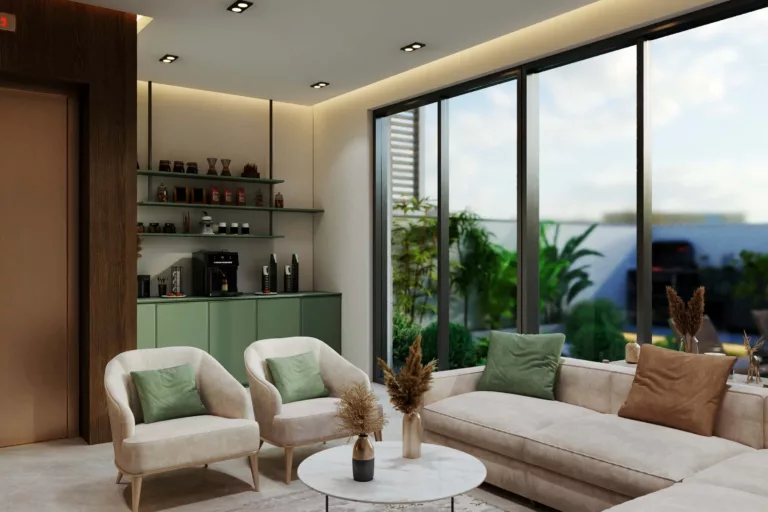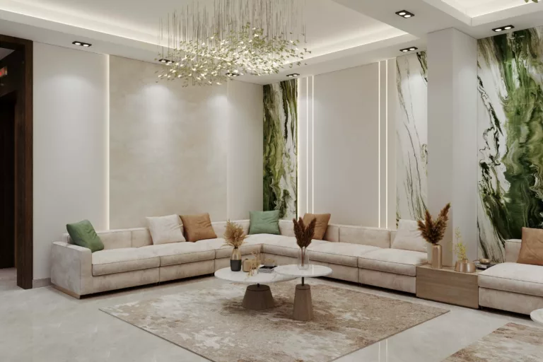 - طاولات رخامية دائرية: تضفي لمسة من الفخامة العصرية وتنسجم مع التفاصيل الخضراء.