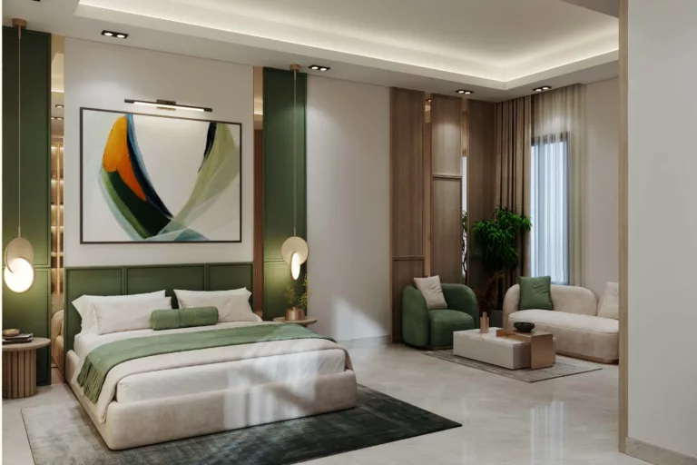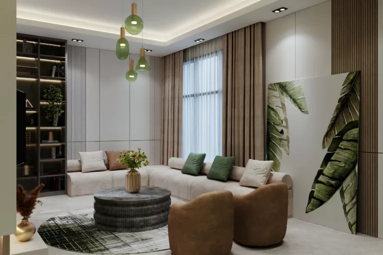 تميز تصميم الفيلا باستخدام اللون الأخضر كعنصر رئيسي في الأثاث والديكور، ليعكس مفهوم المنازل الصديقة للطبيعة. تشمل هذه اللمسات: