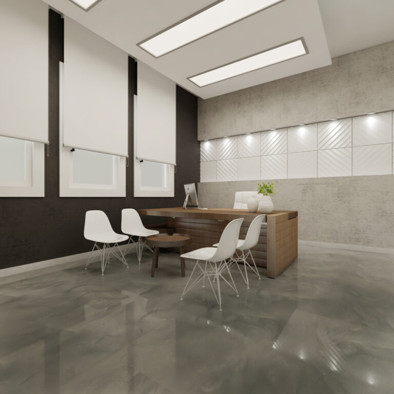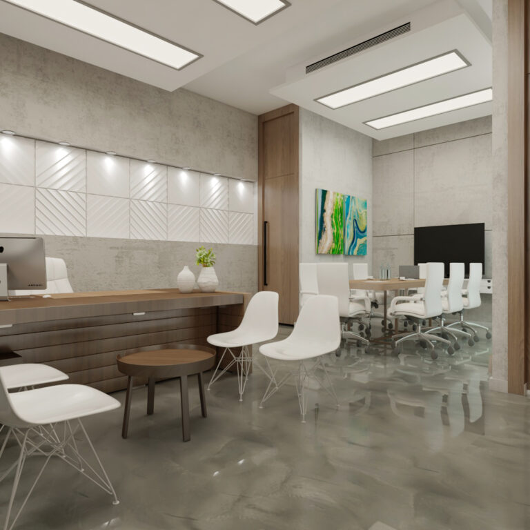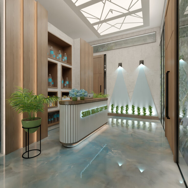 عند مدخل المكتب، يبرز كاونتر الاستقبال بتصميمه الجذاب والمضيء بشعار الشركة “SAVA WATER COMPANY”، تحيط به النباتات الطبيعية التي تضفي لمسة حيوية على الجو العام. يحيط بالمساحة جدران زجاجية وممرات واسعة تعزز الإحساس بالانفتاح والشفافية.