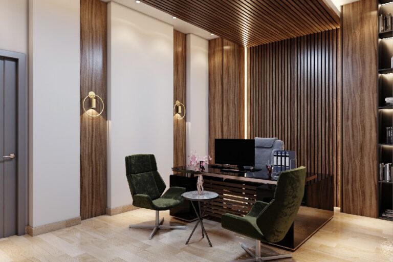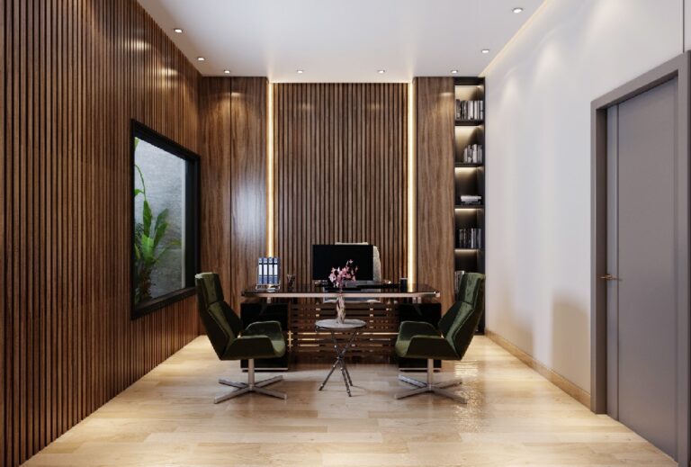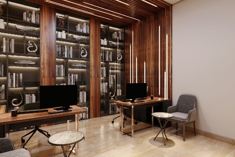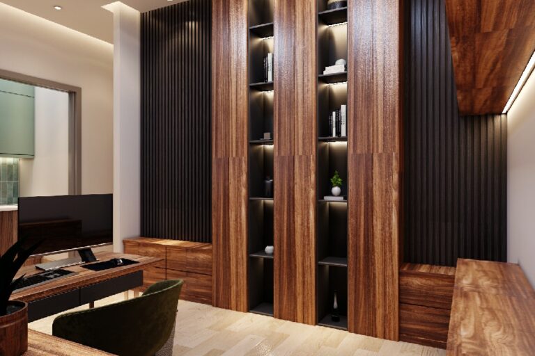 - Executive offices with luxurious wooden finishes and built-in shelves for accessories and books, offering both functionality and aesthetic appeal.