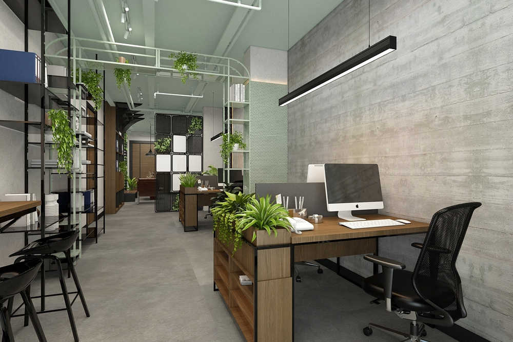 The design features neutral tones, natural wood finishes, and greenery accents that create a warm and refreshing work environment.