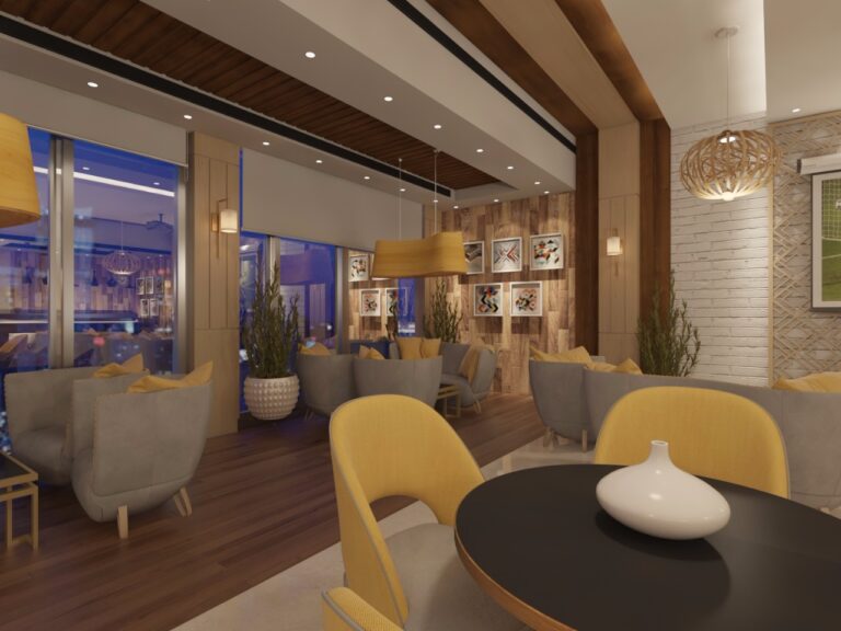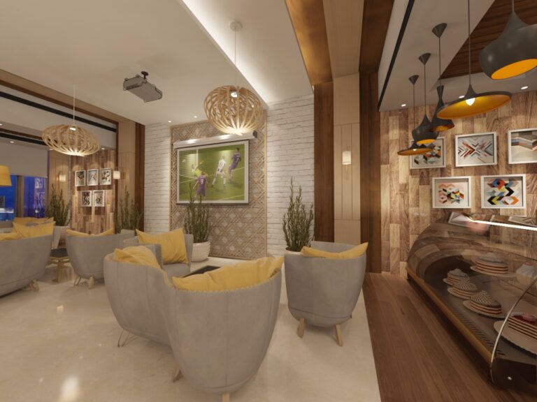 The interior décor includes a dedicated seating area with contemporary furniture, hanging lights that add an artistic flair, and a coffee serving station designed with practical elegance, ensuring a visually and functionally rich experience.