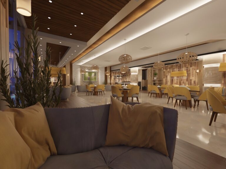 The space features natural materials such as wood and stone, paired with carefully planned lighting that creates a relaxing atmosphere—ideal for social gatherings or quiet work sessions. Earthy tones harmonize with touches of yellow and mustard to bring warmth and vibrancy to every corner of the space.