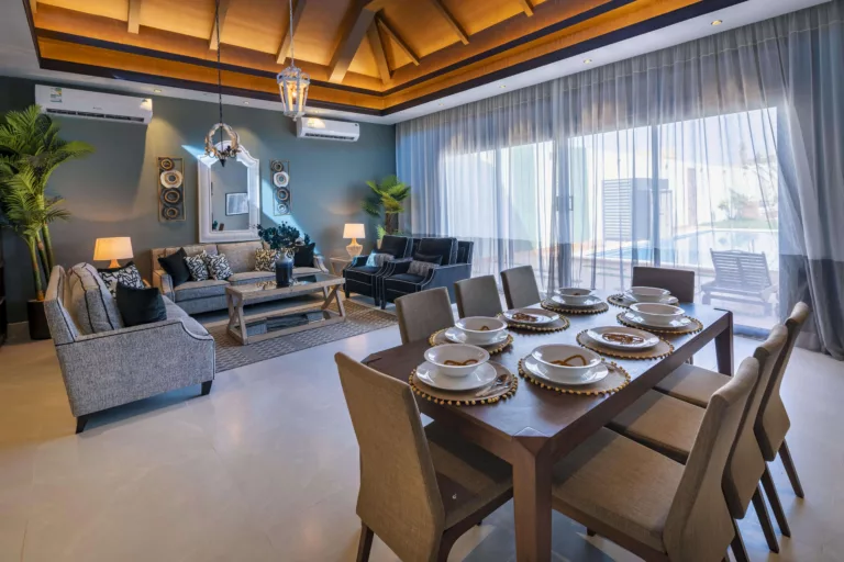 - Classic Furniture and Elegant Chandeliers: Sophisticated pieces paired with sleek, comfortable tables to enhance the ambiance.