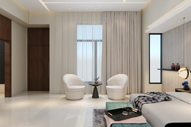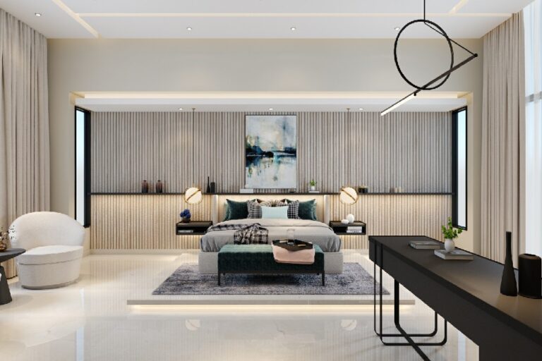 The design features soft color palettes, premium materials, and minimalist modern lines that create a calming, refined ambiance throughout.