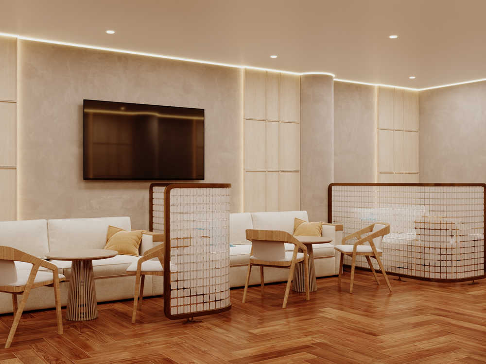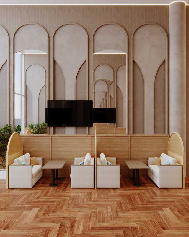 Seating areas are thoughtfully arranged to provide flexibility and comfort, allowing guests to enjoy both privacy and openness. Soft lighting enhances the calm ambiance while highlighting the clean architectural lines and simple decorative details. The overall design maintains a balanced modern character without excessive elements, focusing on clarity and visual harmony.