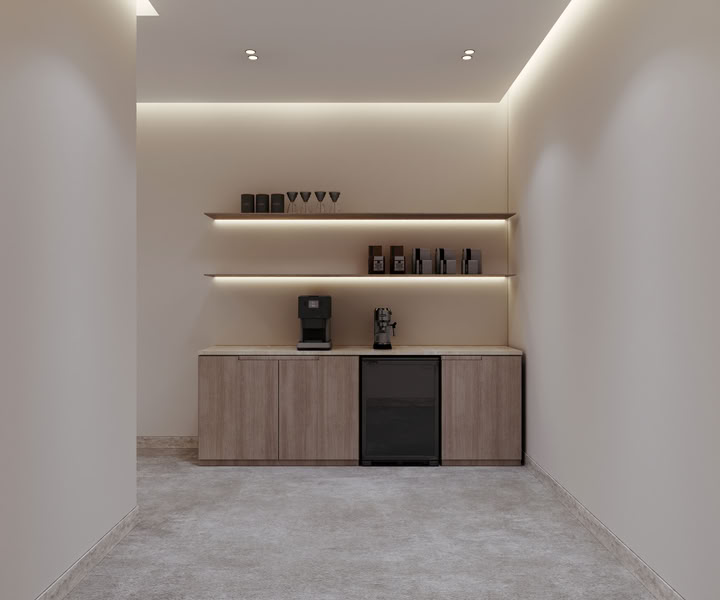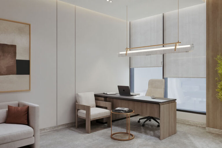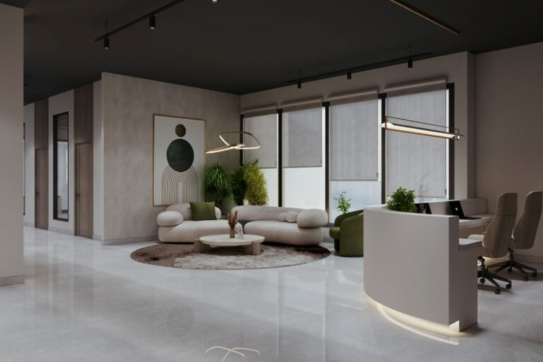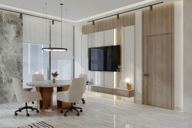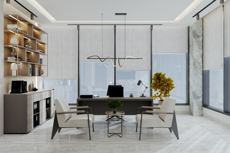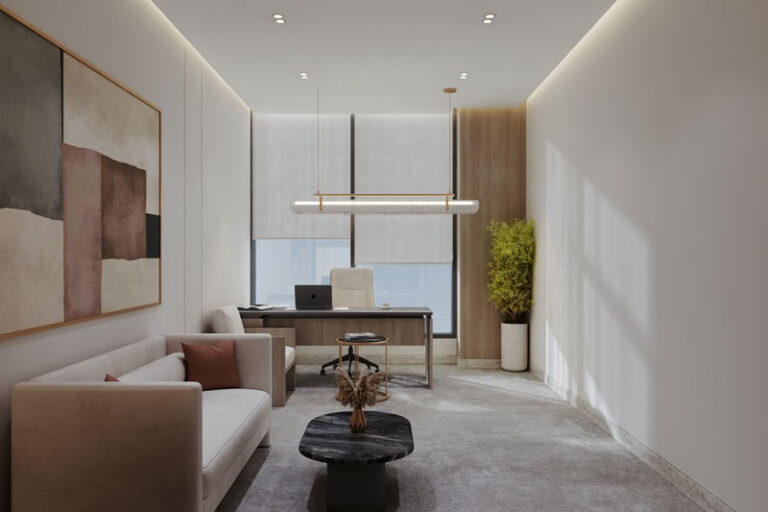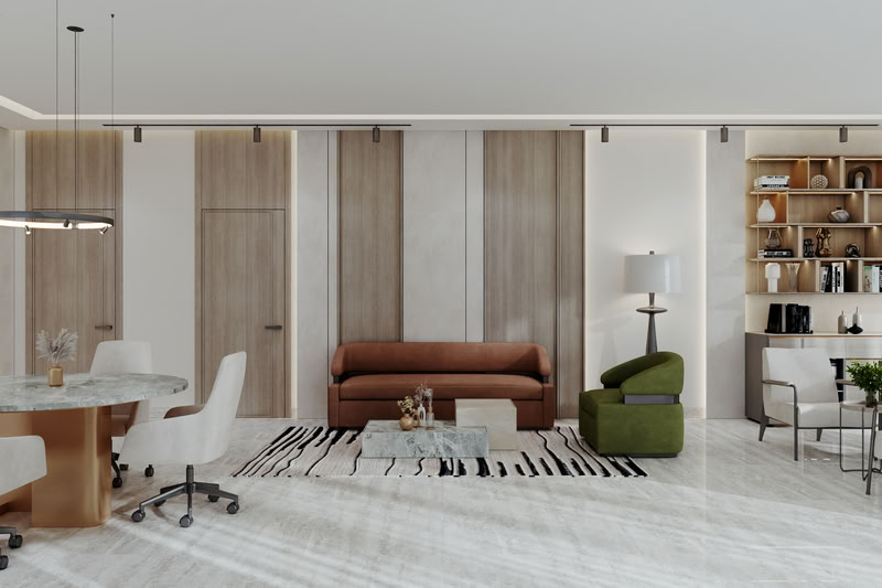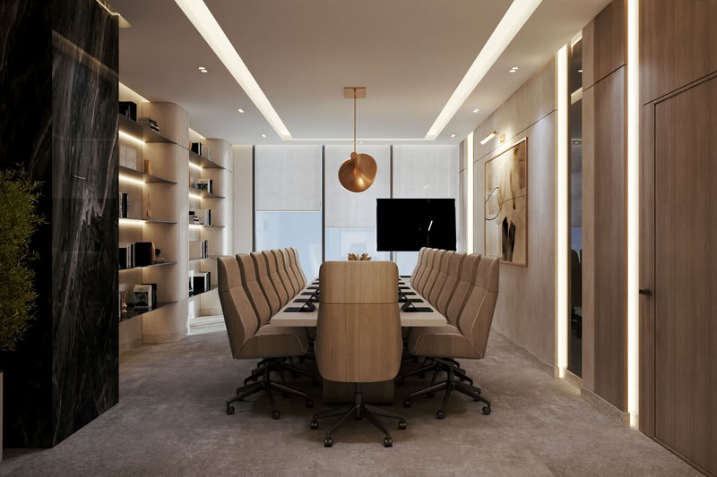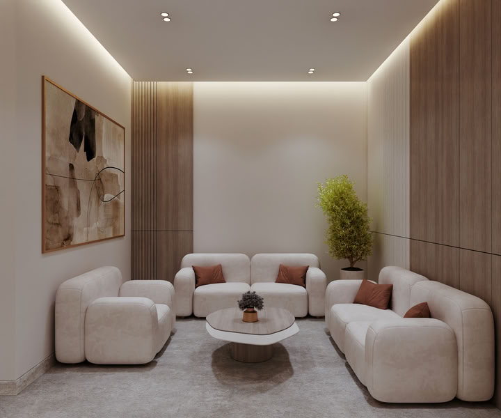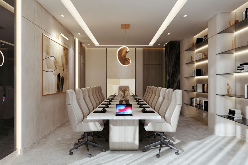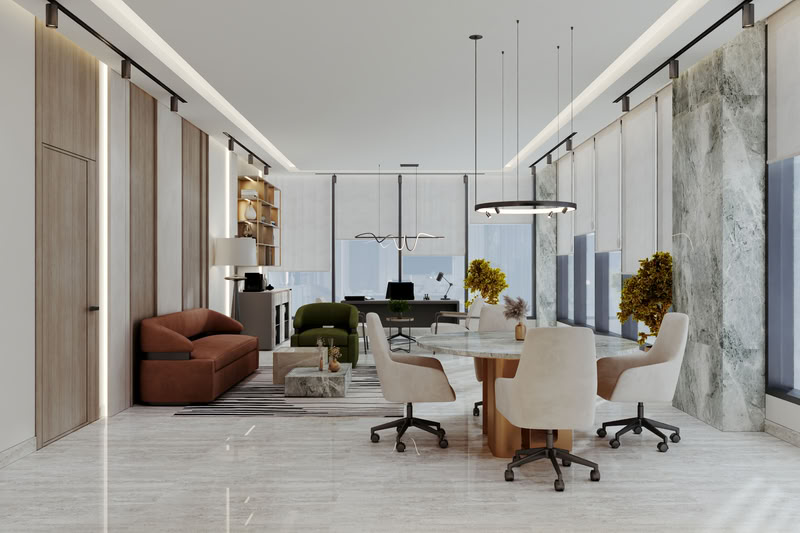 The Company Interior Design Riyadh project is a modern workspace created by Vera Interior, reflecting the company’s experience in designing organized and elegant work environments. The design follows a clean modern style with neutral colors, soft lighting, and warm wood elements that create a calm and professional atmosphere.