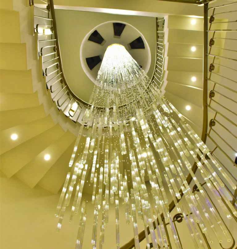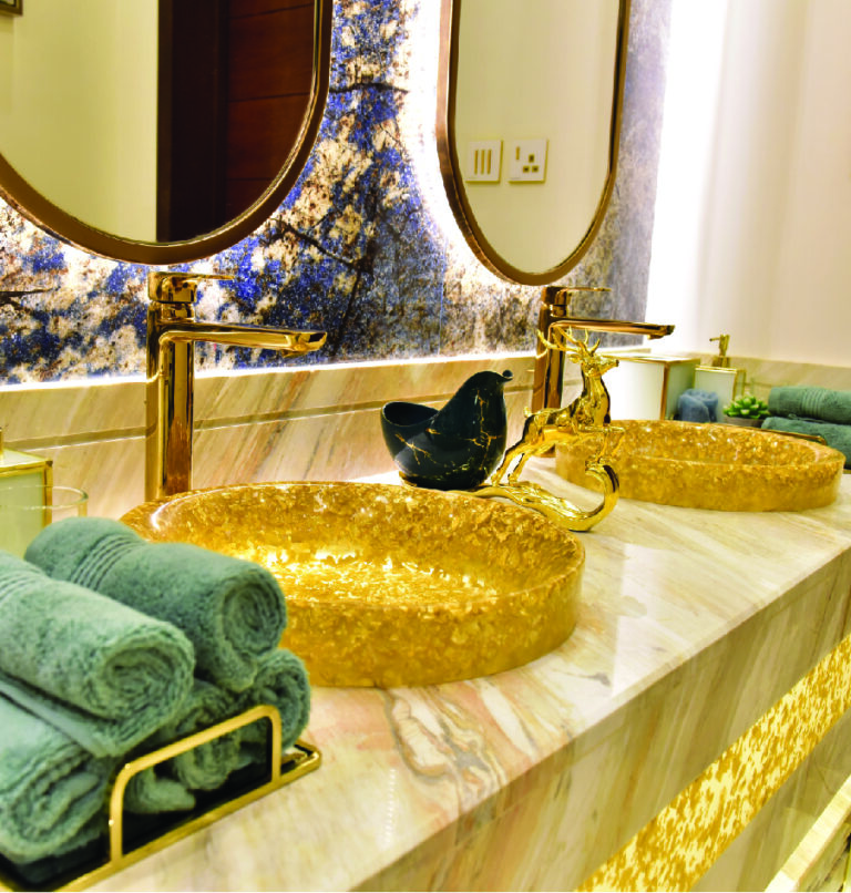 The design features harmonious integration between living areas, reception rooms, and bedrooms. Premium materials such as polished gold, fine marble, dark woods, and plush fabrics are used throughout. Iconic elements include a grand spiral staircase with a chandelier centerpiece, sleek lighting fixtures, and sophisticated decorative accents.